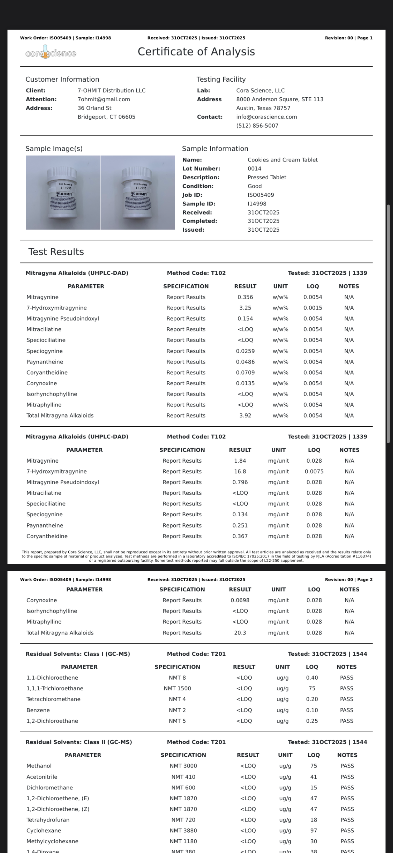 Cookies and Cream Tablets 16.8mg 7OH 20.3mg Total Alkaloids